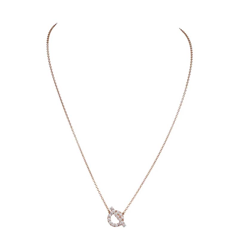 This Necklace is in 18k rose gold San Coloris with bar and ring motif pendant set and round brilliant cut diamonds.
