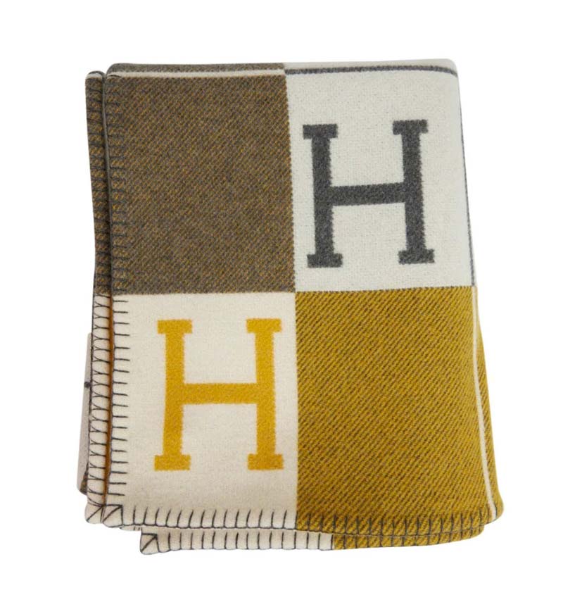 Hermès Avalon II Signature H blanket in gris and soleil made of 90% merino wool and 10% cashmere.