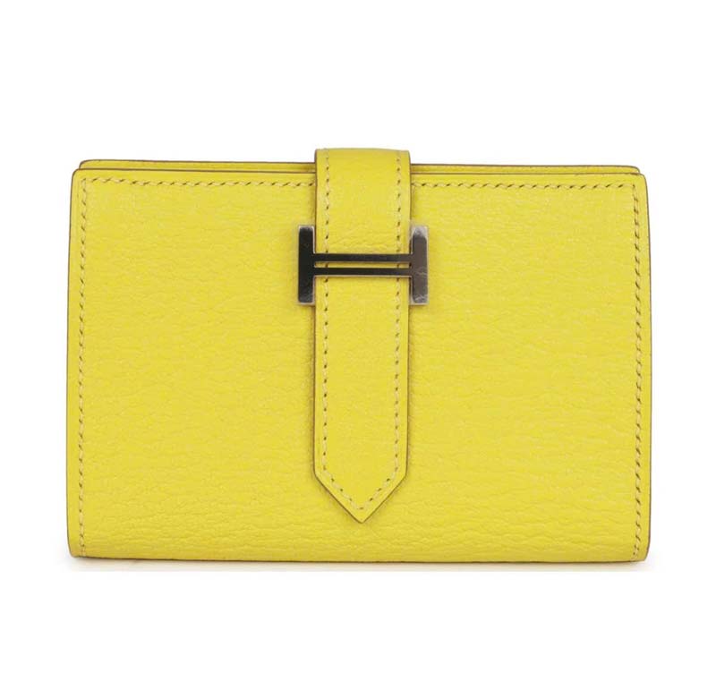 This Bearn Compact Wallet is in lime chevre leather with palladium hardware, tonal stitching, and a loop closure that tucks into a palladium H.
