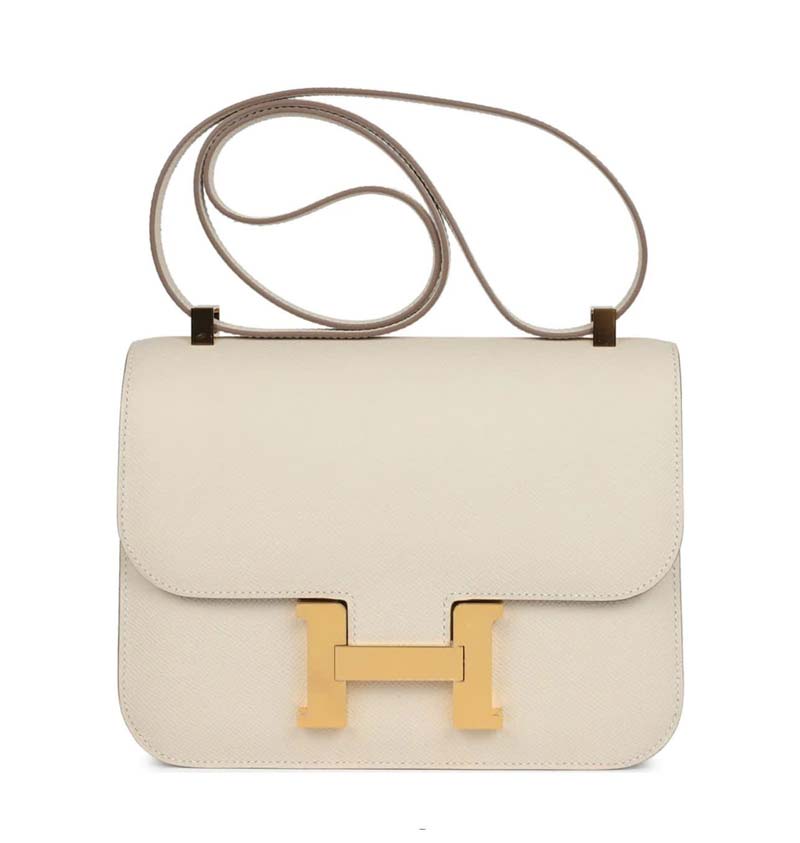 This Constance is in Craie epsom leather with gold hardware and has tonal stitching, a metal “H” snap lock closure and adjustable shoulder strap.