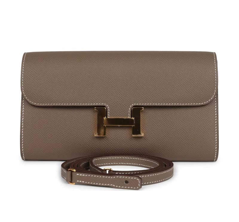 This Constance Wallet To Go is in Etoupe epsom leather with gold hardware and has contrast stitching, metal “H” snap lock closure, open front compartment and removable crossbody strap.