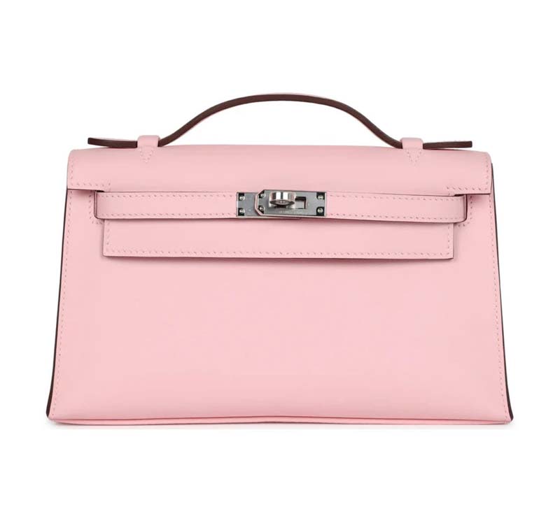 This Kelly Pochette is in Rose Sakura swift leather with palladium hardware and has tonal stitching, front flap, two straps with center toggle closure and a top flat handle.