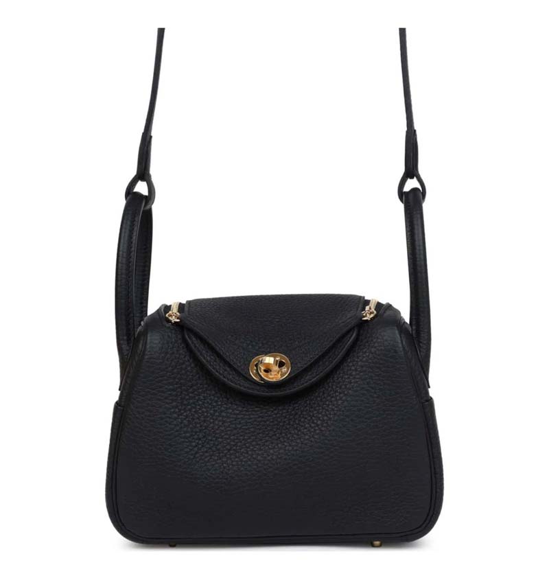 This Mini Lindy is in Black clemence leather with gold hardware and has tonal stitching, double zipper pulls, front Hermès twist lock, single pocket on each side, two rolled top handles linked by a flat shoulder strap.
