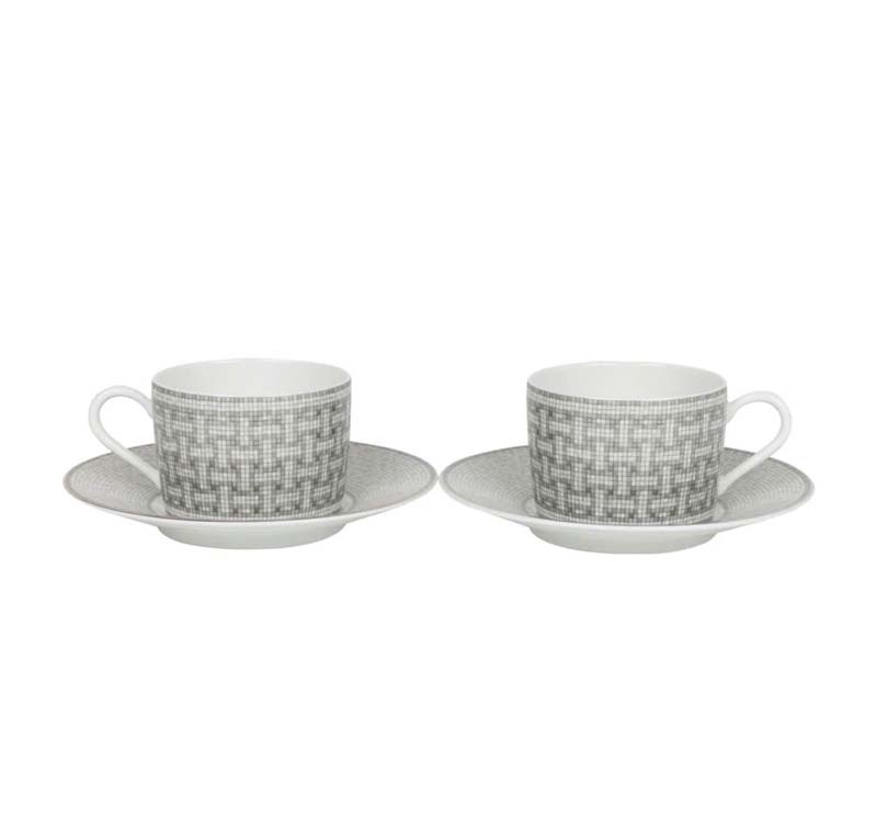 Hermès “Mosaique Au 24” tea cup and saucer set of porcelain in platinum.