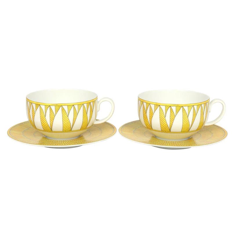This Hermès “Soleil D’ Hermes” yellow porcelain breakfast cup and saucer set features two yellow and white porcelain 12 fl. oz breakfast cups and two saucer with a screen-printed design.